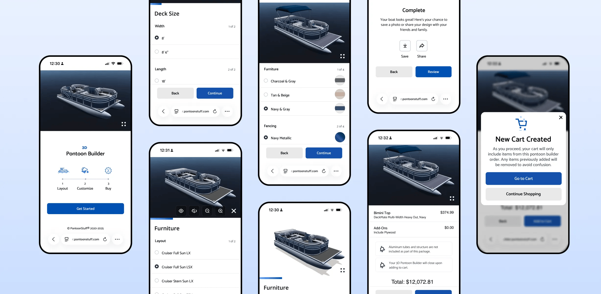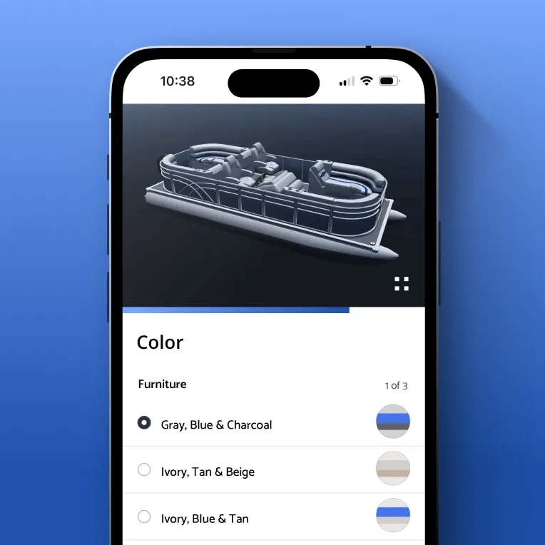 PontoonStuff partnered with us to support boat DIYers looking to rebuild their pontoons from the deck up. We designed a digital experience where users input their deck dimensions, explore layout options, and customize everything from seating to accessories — all through a real-time 3D preview. The result: a streamlined “boat-in-a-box” experience that combines inspiration, configuration, and checkout in one.